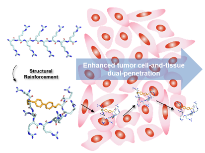 此外,针对如何增强多肽跨生物膜屏障能力开展了相关研究。细胞穿透肽是一类可有效穿透细胞膜的多肽分子,其作为分子转运体被广泛用于药物胞内递送。尽管在过去的二十年间,化学家们发展了多种优化多肽的理化性质的策略,包括引入可刺激响应的基团构建在肿瘤微环境可激活的细胞穿透肽实现选择性细胞穿透,通过多肽环化、非天然氨基酸取代、N-甲基化等化学修饰手段开发新型细胞穿透肽,但其应用仅限于跨越单层细胞膜,由于肿瘤组织高度堆积的细胞和致密的细胞外基质,大多数药物很难有效渗透肿瘤病变处,导致深部肿瘤中癌细胞的存活,进而引起肿瘤复发和转移。因此,如何实现针对肿瘤组织的多层细胞穿透是进一步提高药物治疗效果的关键。