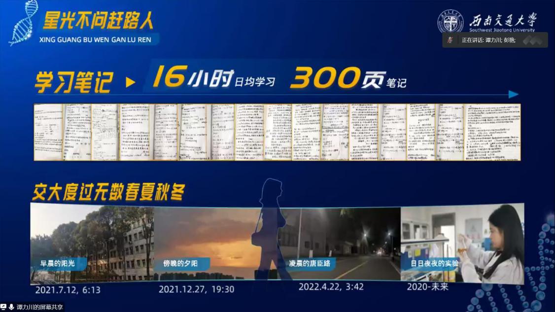 2022年硕士国家奖学金获得者、研究生竢实扬华奖章获得者谭力川同学从自身科研、学习及实践方面向同学们分享了她的宝贵经验。她讲到研究生期间一定要勤奋努力。在积极投入科研工作的同时,也要多参加一些学术研讨会,这不仅可以拓宽视野,还有可能为科研提供新的思路。最后,谭力川同学还分享了自己的学习经验,从做实验的各个细节讲述有效可行的学习方法,提醒同学们一定要养成做笔记的习惯。